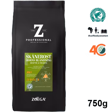 ZOÉGAS Professional Skånerost är ett klassiskt mörkrostadt bryggkaffe med kraftfull smak och nyanserad friskhet med toner av lakritsrot, kakao och nöt. Lång eftersmak av mogna bär. Kaffet får sin unika karaktär från bland annat brasilianska pärlbönor, högvuxna bönor från Centralamerika kompletterat med bönor från Kenya. Originalet från 1918 togs fram till dåvarande Hotell Horns i Malmö, senare döptes blandningen om till Skånerost.