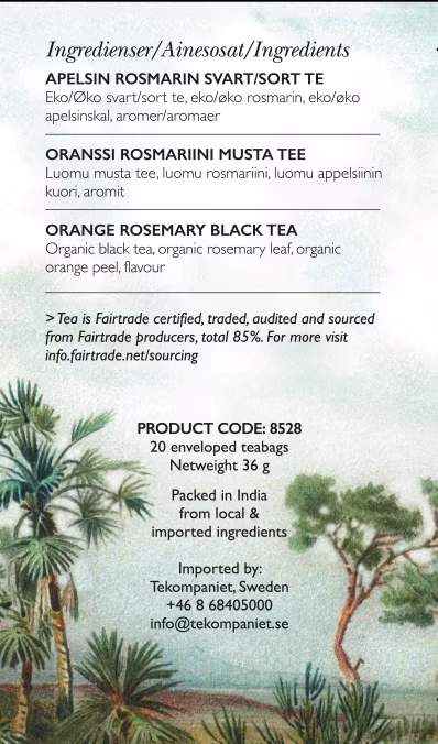 Eko svart te, eko rosmarin, eko apelsinskal, naturlig apelsinarom.