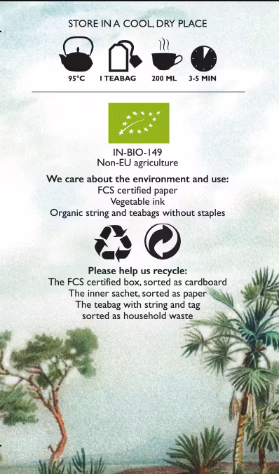 Varje tepåse är individuellt förpackad i ett tätt kuvert för att bevara teets kvalité och den unika aromen. 20 tepåsar/ask. 6 askar/kartong.