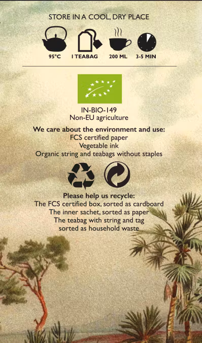 Varje tepåse är individuellt förpackad i ett tätt kuvert för att bevara teets kvalité och den unika aromen. 20 tepåsar/ask. 6 askar/kartong.