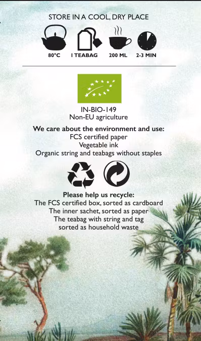 Höglandste från södra Indien med en bas av vitt te men även lite grönt te. Vitt te har i grunden en mycket mild och mjuk karaktär med en naturlig sötma. Tydlig smak av kryddor, ex kardemumma, stjärnanis, kanel och peppar. Vitt te dricks med fördel utan mjölk. Brygg det inte mer än 2-3 minuter. Ekologiskt och Fairtrade-certifierat.