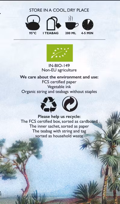 Varje tepåse är individuellt förpackad i ett tätt kuvert för att bevara teets kvalité och den unika aromen. 20 tepåsar/ask. 6 askar/kartong.