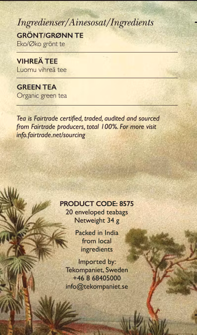 Grönt neutralt te som ger minnen av en nyslagen äng och en åktur på hövagnen, med ett inslag av honung. Klassiskt och gott. Bör drickas utan mjölk för att komma till sin rätt. Ekologiskt och Fairtrade-certifierat.