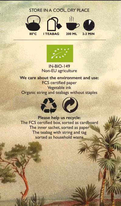 Varje tepåse är individuellt förpackad i ett tätt kuvert för att bevara teets kvalité och den unika aromen. 20 tepåsar/ask. 6 askar/kartong.