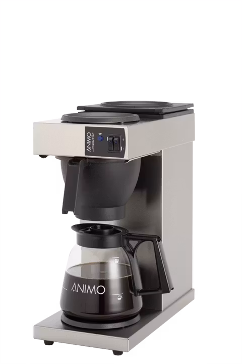 Semiautomatisk bryggare med dubbla värmehällar och manuell vattenpåfyllning. Levereras med en glaskanna (1,8 l) och filterhållare.