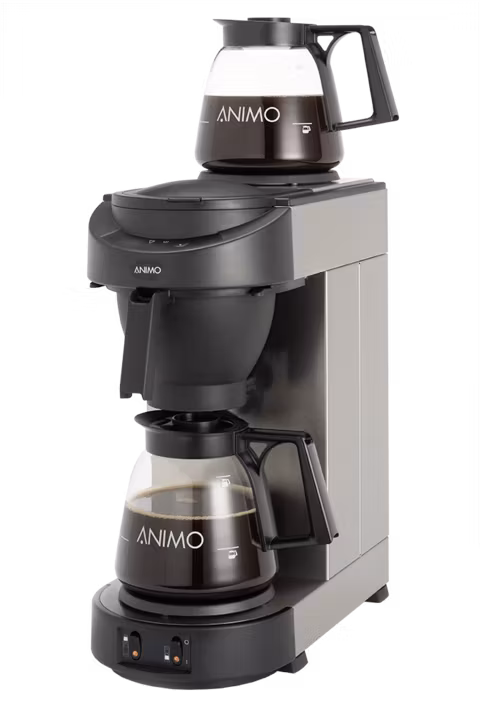 Semiautomatisk bryggare med dubbla värmehällar och manuell vattenpåfyllning. Levereras med två glaskannor (1,8 l) och filterhållare. Tillverkad av rostfritt stål.