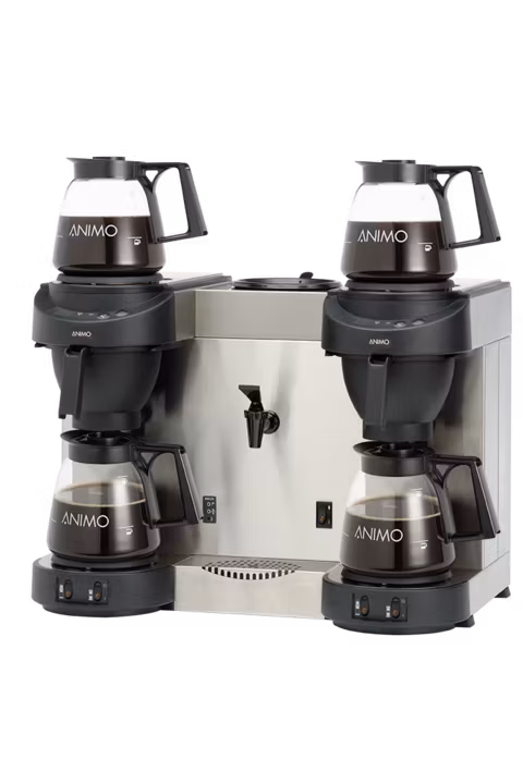 Dubbel kaffebryggare för fast vattenanslutning, med fyra värmehällar och separat tevattentapp. Levereras med fyra glaskannor (1,8 l), filterhållare och spillbricka. Tillverkad av rostfritt stål. Timkapacitet 36 liter kaffe (288 koppar) 21 liter tevatten (168 koppar)
