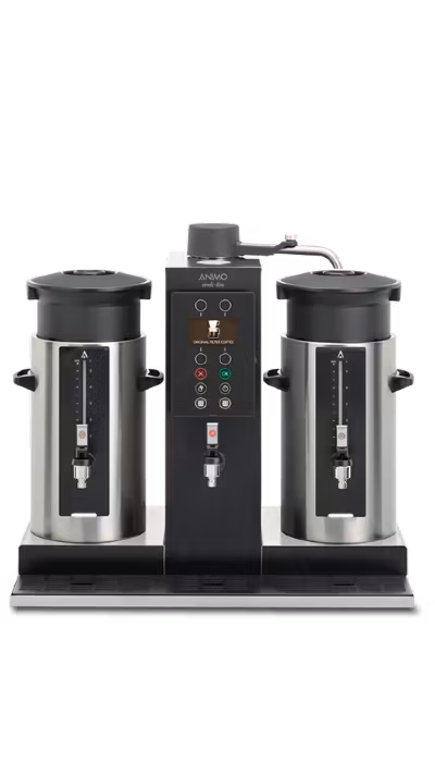 Denna dubbla urnbryggare med tevattentapp för placering på bänk ger både hög kapacitet och stor flexibilitet. Den är lättplacerad och ger en hög kapacitet. Tillverkad i rostfritt stål och utrustad med en kapacitiv kontrollpanel med en tydlig informationsskärm. Denna urnbryggare brygger 5 liter kaffe på bara 10 minuter.