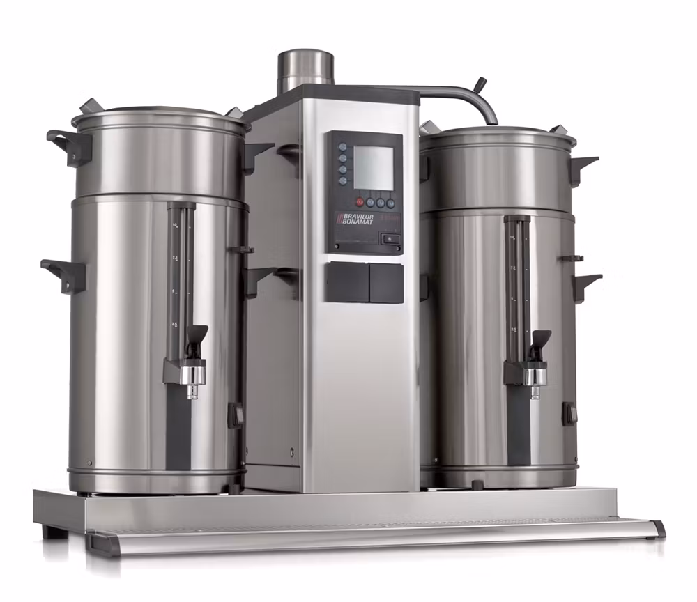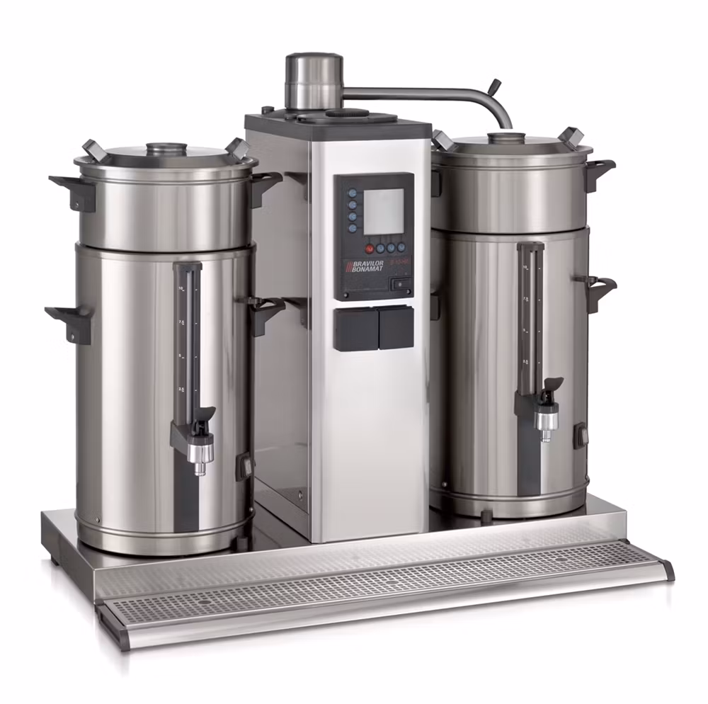 Rund bryggmaskin för utrymmen med vattenanslutning. Brygger stora mängder kaffe i separata behållare. Utrustad med digital display, total- och dagräknare, avkalkningssystem, signal när kaffet är klart, inbyggd timer och hög säkerhet. Levereras med behållare av VHG-typ, bryggenhet(er) och spillbricka.